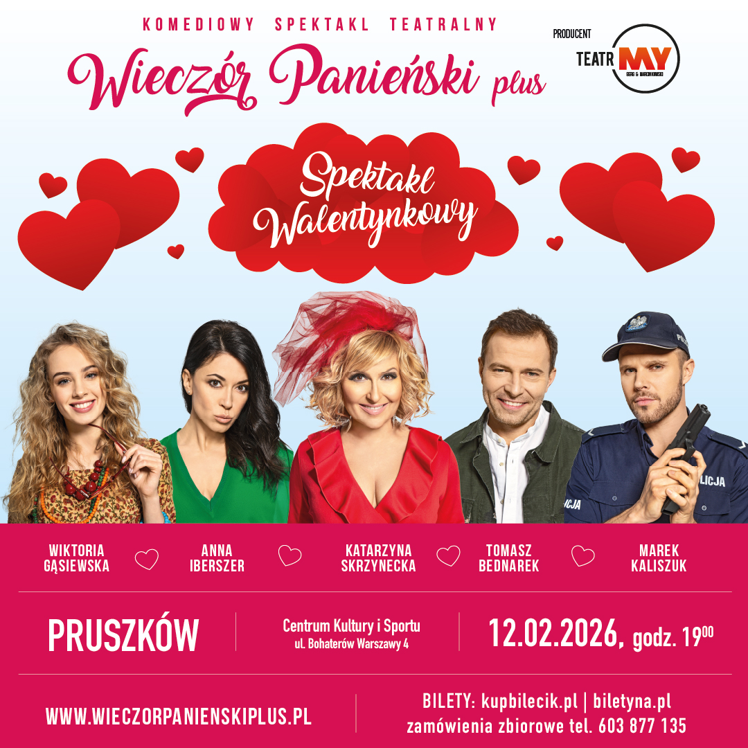 12.02.2026 - PRUSZKÓW - WALENTYNKOWY WIECZÓR CKiS Sala Widowiskowa, godz. 19.00 Obsada: K. Skrzynecka, A. Iberszer, W. Gąsiewska, T. Bednarek, M. Kaliszuk